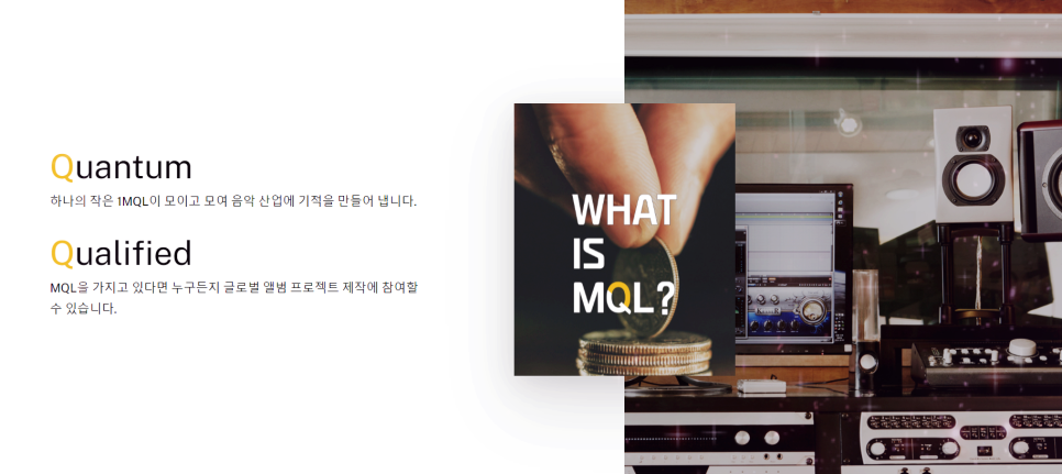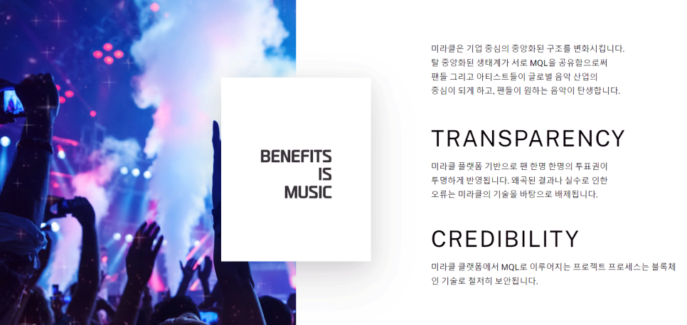 미라큘은 전 세계 음악팬들을 위한 문화 엔터테인먼트 플랫폼입니다. MQL 프로젝트는 블록체인 기술과 엔터테인먼트 산업의 융합이라고 할 수 있습니다. 많은 분들이 아시는 블록체인의 장점인 탈중앙화 및 보안, 투명성을 엔터테인먼트 산업과 결합하여 기존 문화, 엔터테인먼트가 가지고 있는 다양한 문제점을 보완하여 보다 건전하고 투명한 생태계를 구축하고 목표로 하는 프로젝트입니다. 이를 통해 많은 팬들이 아티스트와 안전하고 투명하게 상호 작용할 수 있도록 합니다.