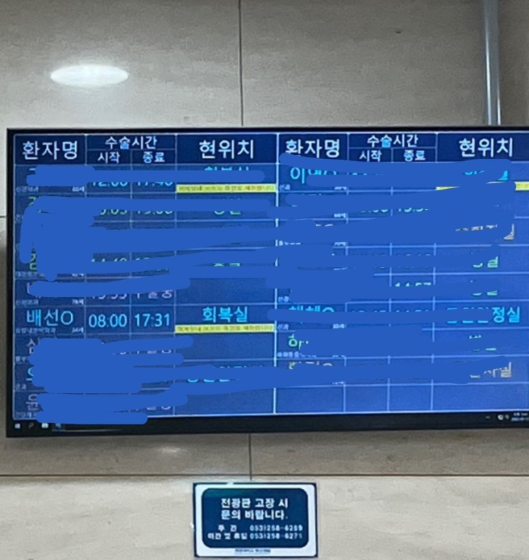 심심해서 병원 여기저기 돌아다녔는데 어디 계시냐고 간호사 선생님께서 계속 전화해 주셔서 그때부터 병실에 가만히 있었다.이빈후부과에 가서 성대검사를 하고 전담간호사 선생님이 오셔서 전공의 선생님이 오셨다.수술시간은 점심 전에 한다고 했어.그날 사실 교수님께서 수술을 하시는 날이 아니라 다른 과 수술이 끝나면 그때 제가 수술을 하겠다고 하셨는데 다시 달려오셔서 첫 번째 타임 수술로 바뀌었다고 했다.교수님이 그날 다른 과에 양해를 구하고 다른 과에서도 배려를 많이 해줬다고 하셨다.수술 예상 시간은 7시간!
