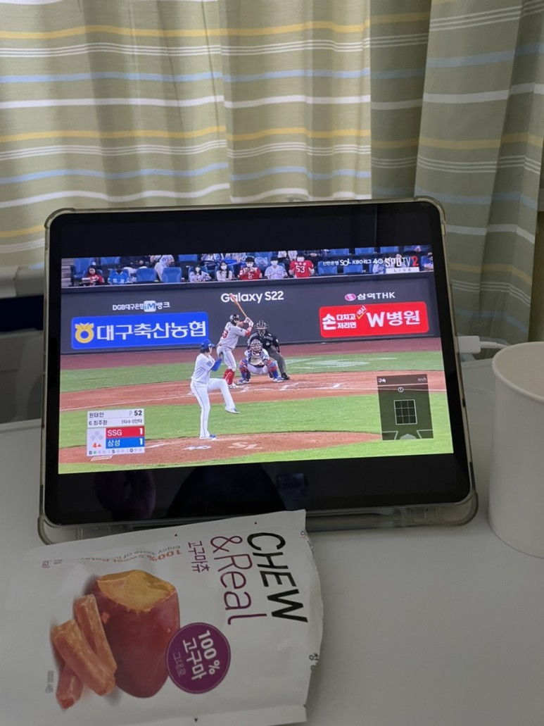 수술하기 전에 여유를 보이면서 야구와 고구마 건어물을 먹었다.