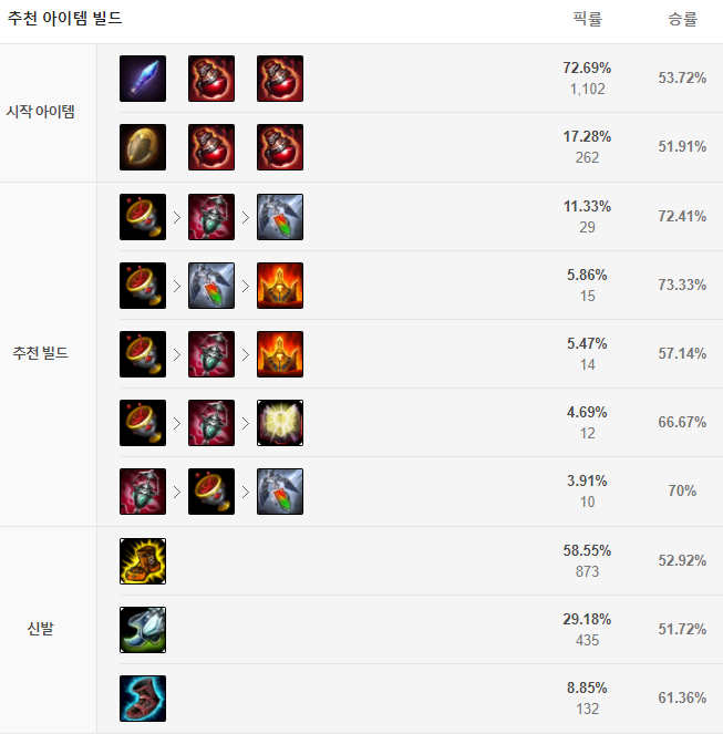 가장 많이 선정된 유성 룬은 픽률이 62%에 달합니다.잔나는 워낙 라인전 진행 중에 W샷을 자주 날리는 편이라 유성을 올리면 상대에게 상당한 피해를 계속 줄 수 있기 때문입니다.그리고 메인룬에서의 세부적 특성을 보면 민첩성을 선택한 것이 보입니다.잔나는 백업과 로밍을 주로 하는 챔피언이기 때문에 이 속도를 중시합니다.그래서 때로는 메인에서 맨 아래에 있는 특성도 주문 작열이 아니라 물 위를 걷는 사람을 선택하기도 합니다. 만약 미드로밍을 자주 가는 상황이 나올 것 같으면 주문 작렬보다는 물 위를 걷는 사람을 꼽는 선택도 나쁘지 않다고 할 수 있습니다. 아이템 빌드