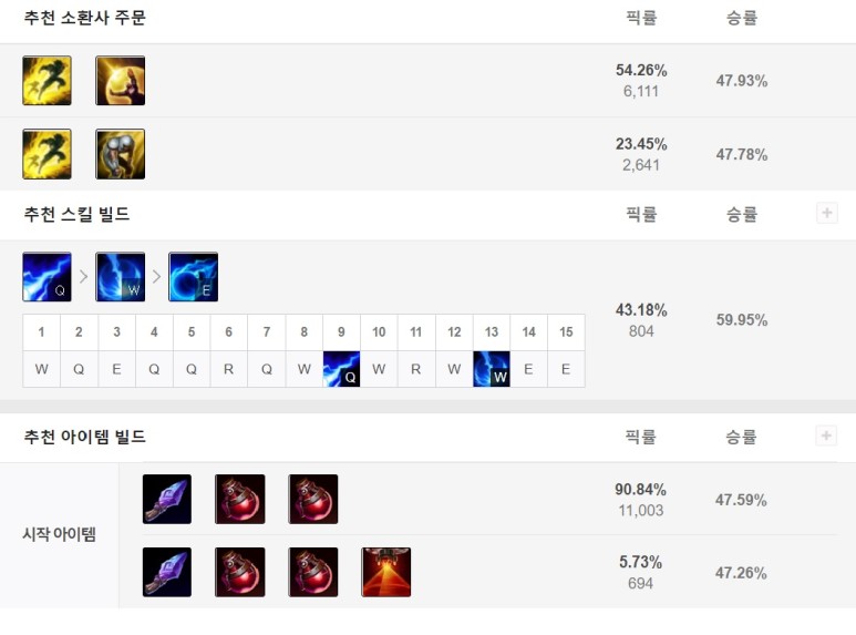 패시브와 Q를 활용해 끊임없이 딜을 넣어주는 것이 포인트이기 때문에 QWE 순으로 선마를 해주면 된다. 스킬은 Q를 먼저 사용하는 것이 아니라 W를 통해 슬로우를 붙여 Q를 맞추는 것이 좋고 E는 갱을 흘리는 유일한 스킬이므로 확실하게 맞힐 때 활용하는 것이 좋다.