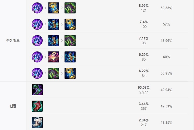 마나를 회복하는 패시브들이 있지만 그래도 마나가 부족하다 보니 양피지가 고정되어 추가 딜을 더 넣을 수 있는 루덴을 가장 많이 간다. 이후 아이템은 상대 챔프 중 회복기나 흡혈이 많으면 모렐로, 강제니까 슈가 많으면 존야, 딜을 더 넣고 싶으면 지평선의 초점을 가면 되는데 전체적으로 딜을 올리는 미드챔피언처럼 쓰면 된다.