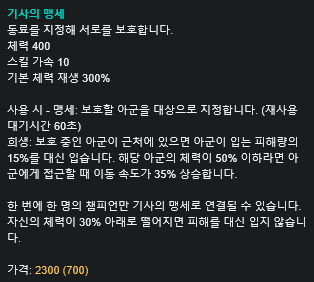 기사의 맹세 체력 400 스킬 가속 10 기본 체력 재생 300% 보호하는 아군을 대상으로 지정하고 보호 중인 아군이 가까이 있으면 입는 피해량의 15%를 대신 받습니다.아군 체력이 50% 이하면 아군 접근 시 이동 속도가 35% 상승합니다.