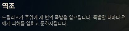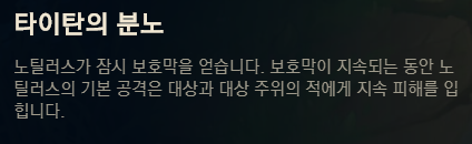 타이탄의 분노 W보호막을 얻는다.보호막이 지속되는 시간 동안 노틸러스의 기본 공격은 대상과 대상 주의 적에게 지속 피해를 줍니다.