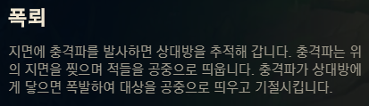 폭뢰 R 지면에 충격파를 발사하면 상대를 추적하고 충격파 위에 적을 공중에 띄우고 지정한 상대를 건드리면 폭발해 대상을 공중에 띄워 기절시킵니다.