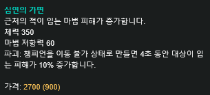 심연의 가면 체력 350 마법 저항력 60 챔피언을 이동 불가 상태로 만들면 4초 동안 대상이 받는 피해가 10% 증가합니다.