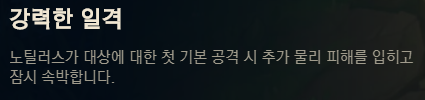노틸러스의 패시브 대상에 대한 첫 기본 공격 시 추가 물리 피해를 입히고 속박시킨다.