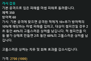 가시갑투구 체력 350 방어력 60 기본 공격에 해당하면 공격한 적에게 10+추가 방어력의 10%에 해당하는 마법 피해를 입히고 챔피언의 경우 2초간 40%의 고통스러운 상처를 남깁니다.