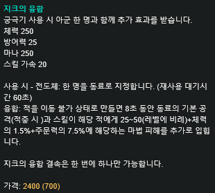 지크의 융합체력 250 방어력 25마나 250 스킬 가속 20 사용 시 1명을 동료로 지정합니다.이동불가 상태로 만들면 동료의 기본 공격과 스킬이 해당 적에게 적중 시 체력의 1.5%+주문력 7.5%에 해당하는 마법 피해를 줍니다.