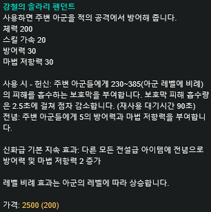강철의 솔라펜던트 체력 200 스킬 가속 20 방어력 30 마법 저항력 30 사용 시 주변 아군에게 230~385의 보호막을 부여합니다.