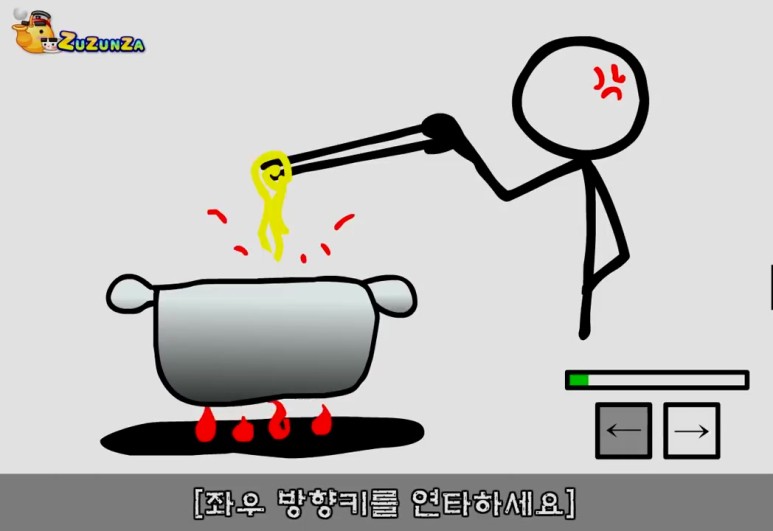 라면 만들기 플래시 게임의 마지막 단계로 이제 면만 제대로 끓이면 라면 만들기 플래시 게임은 종료됩니다. 좌우 방향 키를 번갈아 눌러 주세요. 그러면 연두색 게이지가 점점 채워지는데 절대 한쪽 방향을 2회 누르지 않도록 주의하면서 적절히 조절해 주십시오.