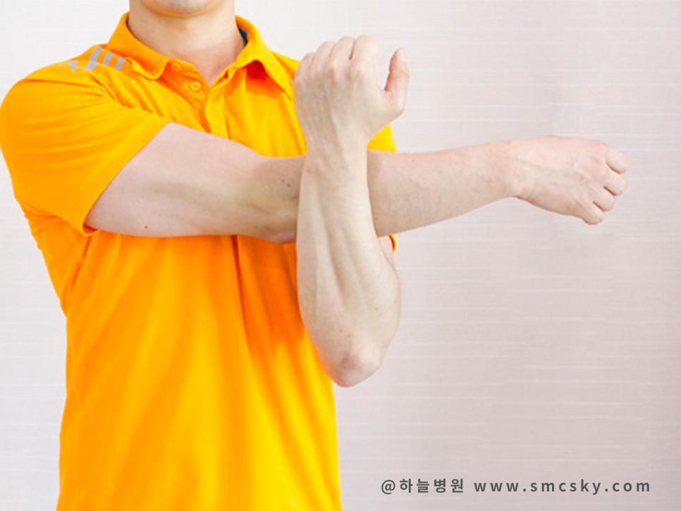 - 오십견 증상이 있는 팔을 뻗은 상태에서 다른 팔로 팔 팔꿈치 아래를 들어 올립니다. 부드럽게 몸쪽으로 당깁니다.