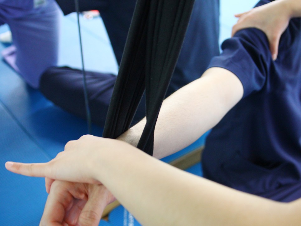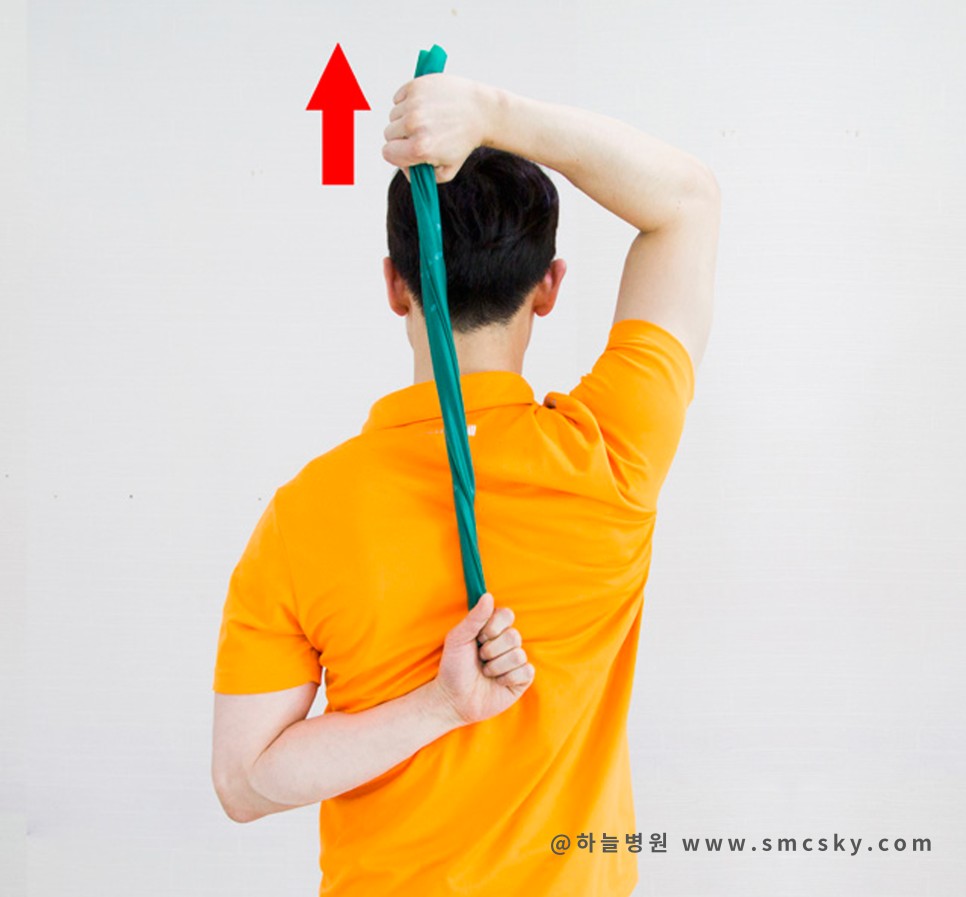 - 타월이나 탄력 밴드를 이용합니다.- 사진상 왼쪽 어깨 통증이 있는 팔을 아래 정상 팔을 위에 위치하며 등 뒤로 수건 양끝을 잡습니다. 정상적인 팔로 천천히 위로 당겨줍니다.