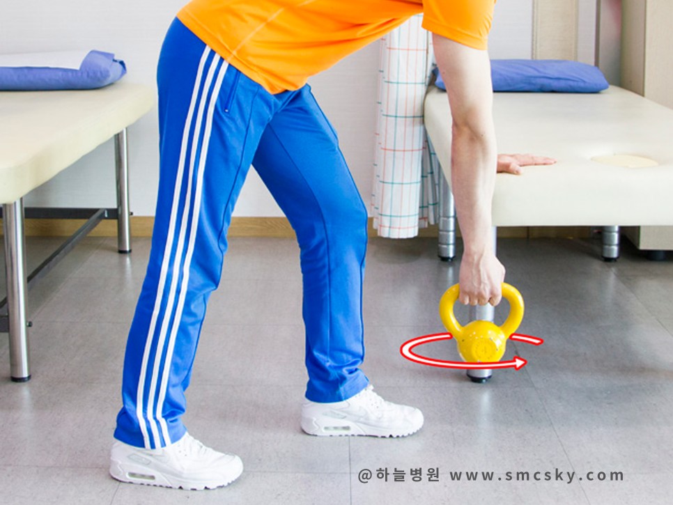 - 정상 팔은 책상에 고정합니다.스트레칭하고 싶은 팔로 적당한 무게의 덤벨 등을 잡고 아래로 내려 천천히 돌립니다. 점차 원의 크기 또는 덤벨의 무게를 늘립니다.
