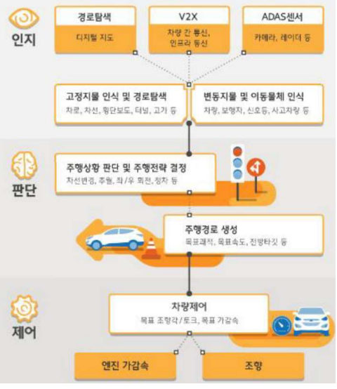 자율주행차는 이전 포스팅에서도 말한 듯 판단, 제어로 나뉜다.그 인지판단 제어의 3가지 방법에 대한 프로세싱 과정이 위 그림과 같이 진행된다.