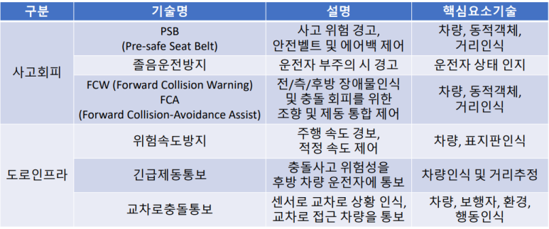 - 전방충돌경보/방지보조시스템 : FCW, FCA 등이 있다. (Radar, camera, LiDAR센서 이용)
