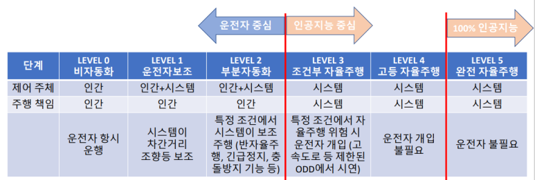 자율주행자동차의 발전계획과 발전사항에 대한 표는 위 그림과 같다(ODD:operational design domains: 쉽게 말해 자율주행에 도움이 되는 인프라가 모두 갖추어져 있는 지역을 가리킨다).