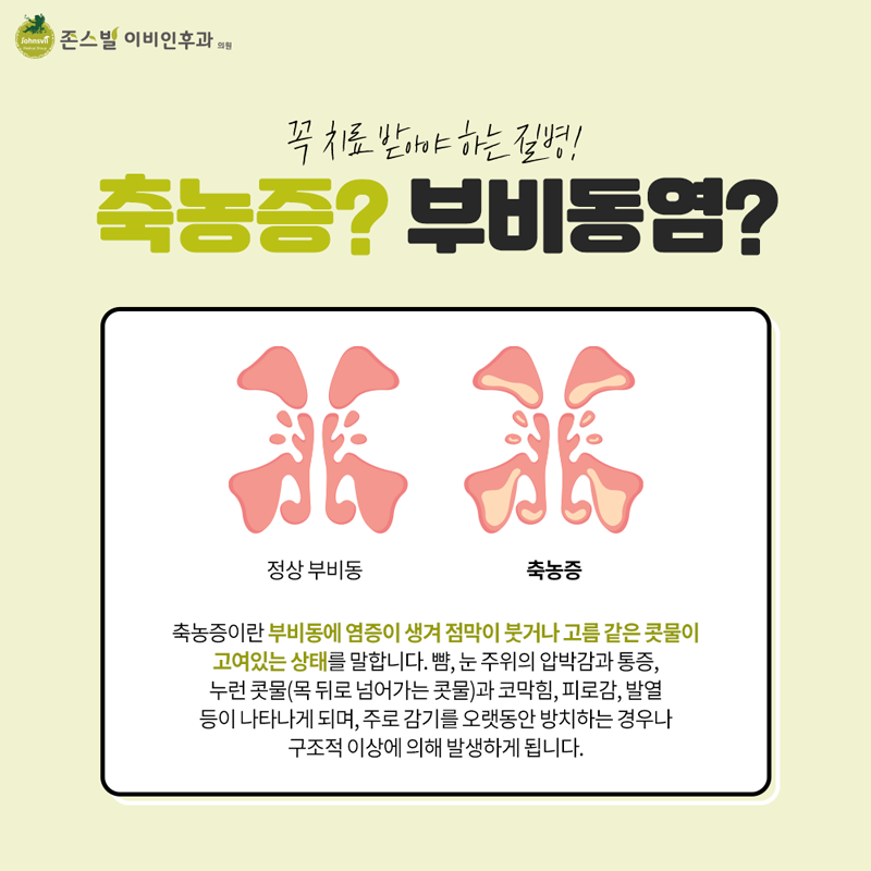 증상이 쉽게 사라지지 않거나 장기간 지속된다면 수원축농증을 의심해봐야 합니다.