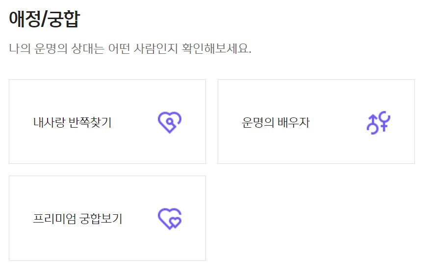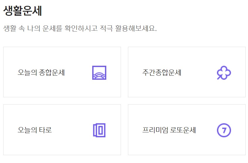 오늘의 운세, 주간 운세, 타로 운세, 로또 운세 등을 볼 수 있고,