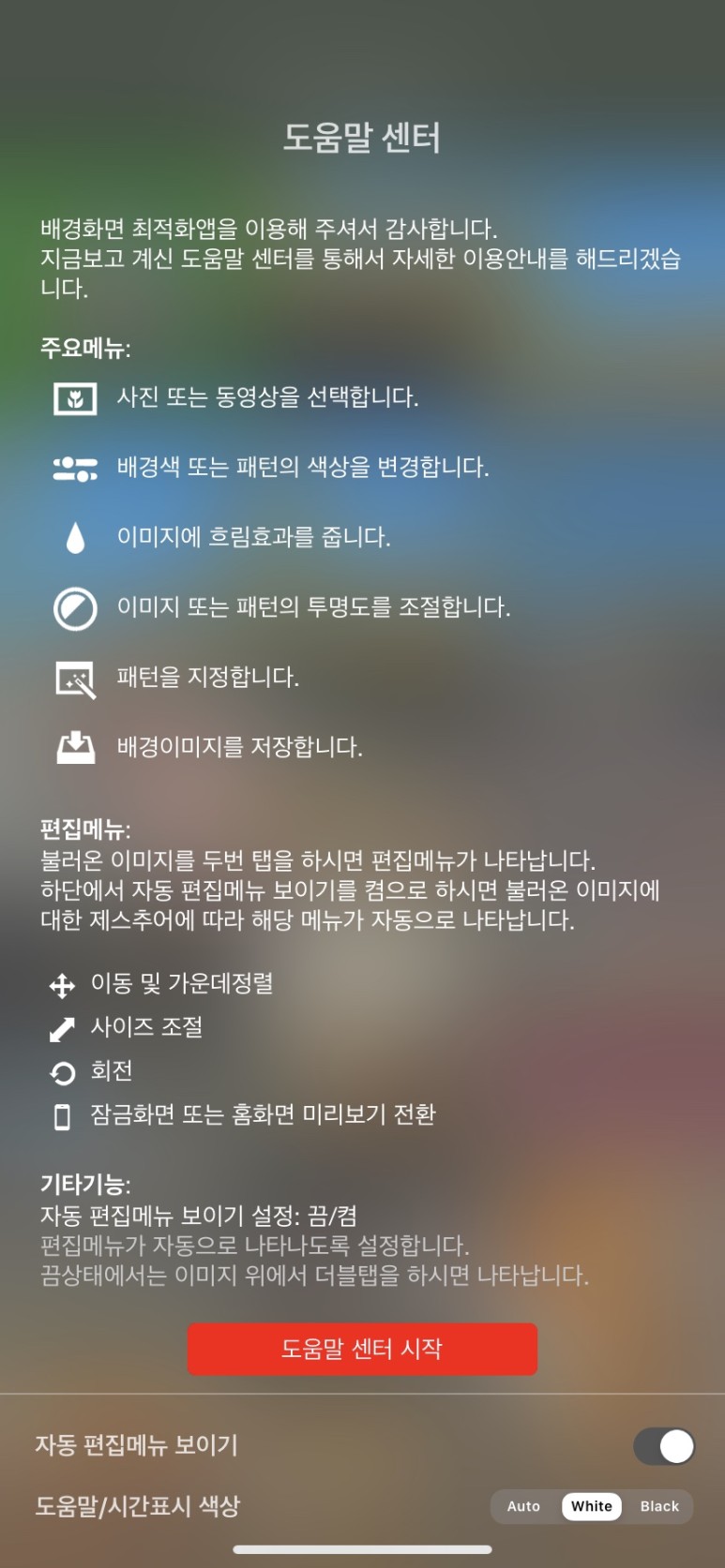 Optimizer Lite 도움말 센터를 살펴보겠습니다.버튼마다 기능을 자세히 알려주고 있네요.~최중요한 사이즈 조절은 두 손가락으로 펼 수 있습니다!