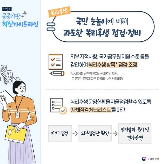 △ 감사원 등 외부 지적사항, 관련 규정, 국가공무원 지원수준 등을 감안해 복리후생 항목*점검·조정*사내대출, 선택적 복지비 외 의료비 지원, 고교 무상교육에 따른 교육비, 사택관리비 등 △’자체점검 체크리스트’를 마련해 기관별 복리후생 운영현황 자체점검→외부점검단 확인→점검결과 공시 및 평가 반영