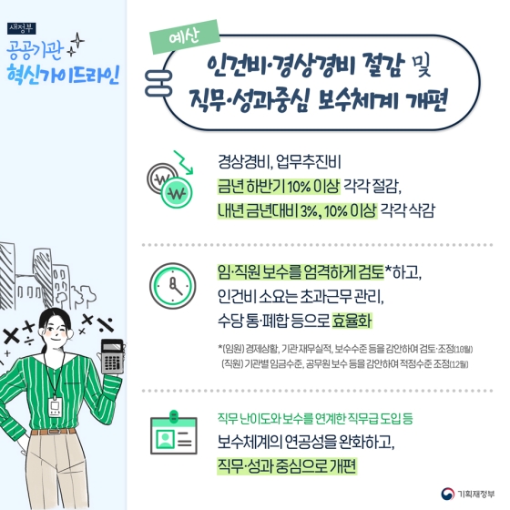 △기관별 올해 하반기 경상경비업추비 예산 10%이상 삭감-‘2023년도는 경상경비 전년대비 3%이상, 업추비 10%이상 삭감△임직원 보수 엄격히 검토*하고 인건비 소요는 초과근무관리, 수당통폐합 등으로 효율화*(임원)경제상황, 기관재무실적, 보수수준 등을 감안하여 검토조정(10월)(직원)기관별 임금수준, 공무원 보수 등을 감안하여 적정수준 조정(12월)△직무난도와 보수를 연계한 직무급 도입·공정성 완화하여 생산성 향상·기존 보수체계 개편한다.