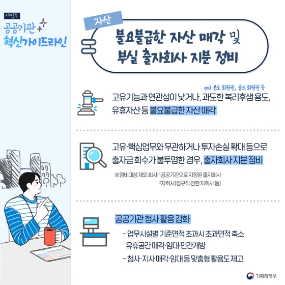 △고유기능과의 연관성이 낮거나 과도한 복리후생 용도, 유휴자산 등 불요불급한 자산 매각 △고유·핵심업무와 무관하거나 투자손실 확대 등으로 출자금 회수가 불투명한 경우 출자회사 지분 정비 △업무시설별 기준면적 초과시 초과면적 축소, 유휴공간 매각·임대, 청사·지사 활용도 제고 방안 강구 ➎ (복리후생) 국민 눈높이에 비해 과도한 복리후생 점검·정비