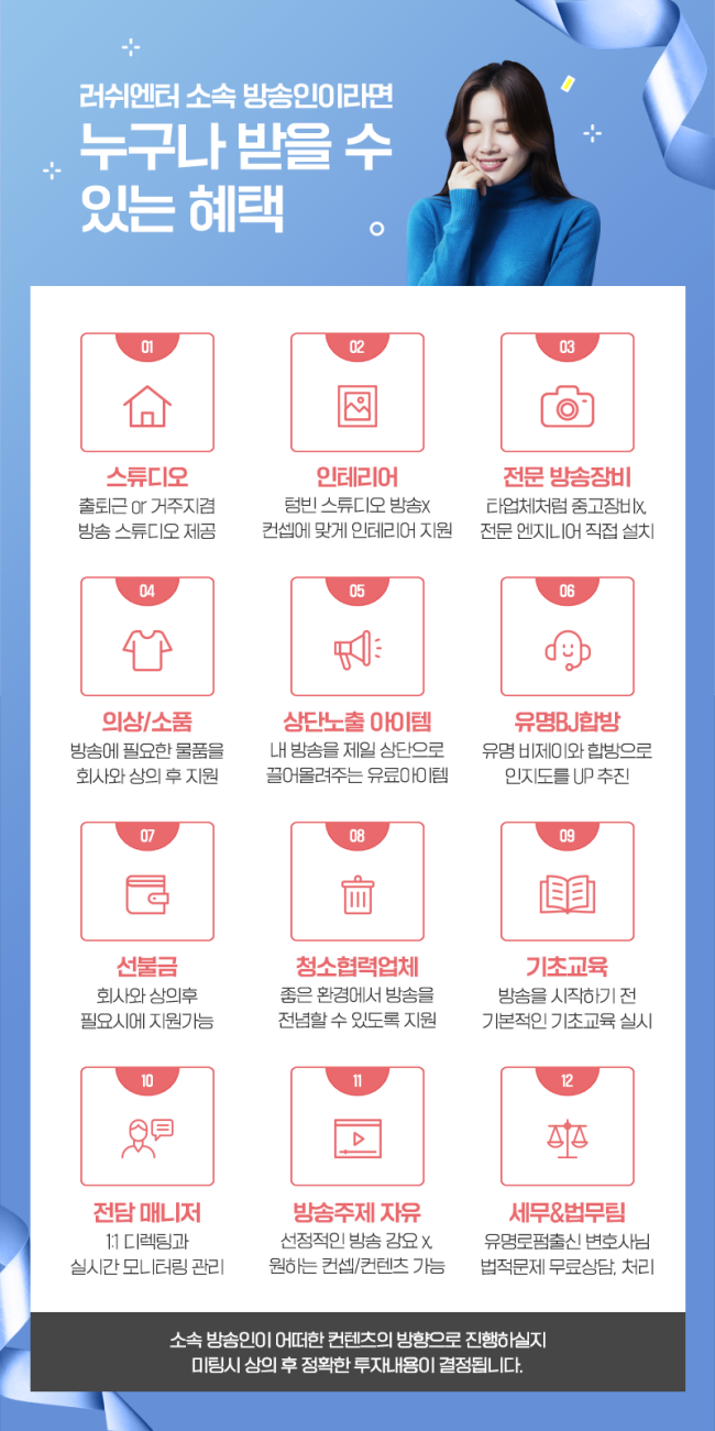 여러분의 BJ 아프리카 방송 방법을 지원할 수 있도록 스튜디오 인테리어부터 의상, 소품, 상단 노출 아이템, 유명 BJ합방, 기초교육, 1:1 디렉팅 등 세부 사항까지 모두 보고 있습니다.