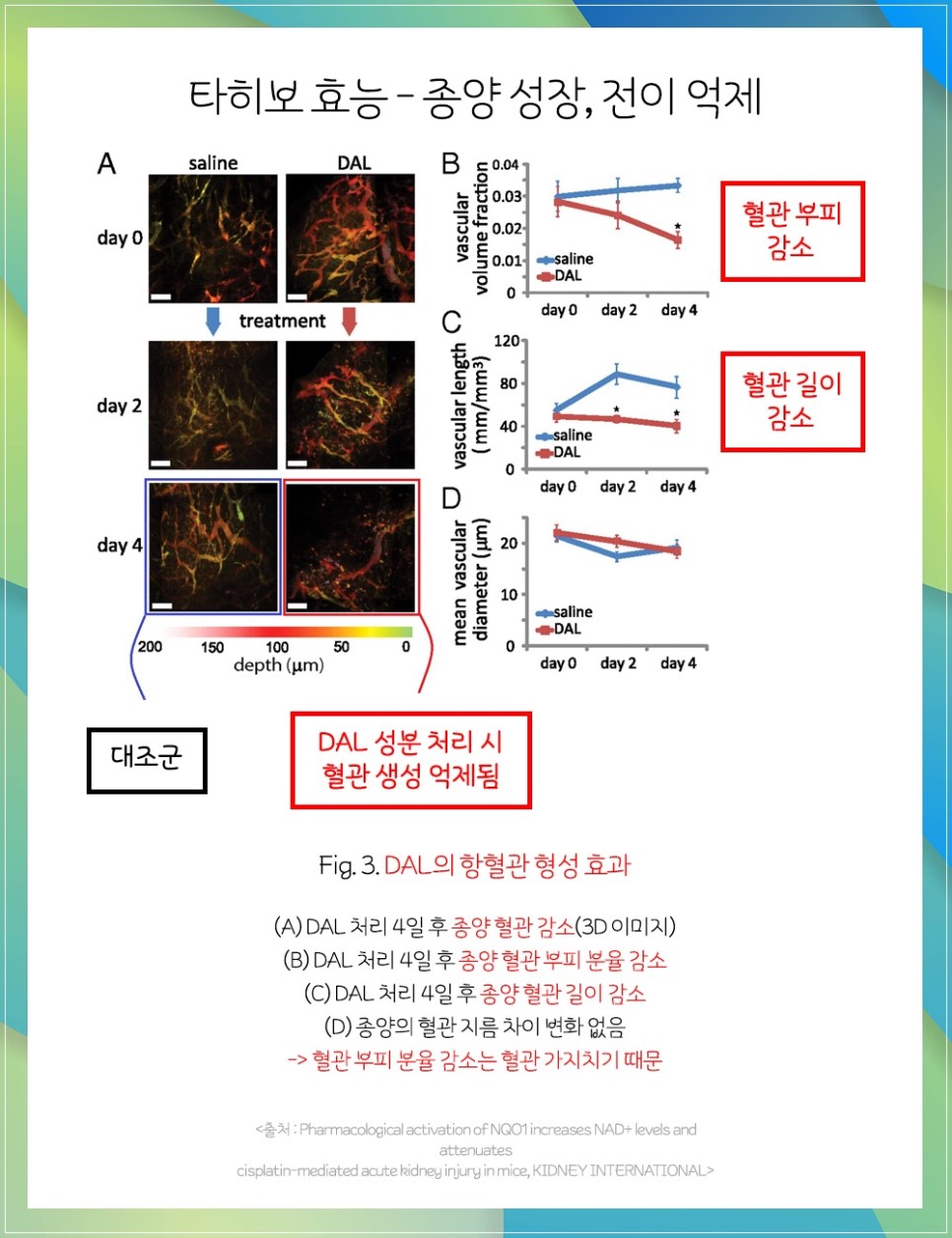 또 다른 성분인 DAL도 항암 작용을 합니다.암세포가 영양과 산소를 공급받기 위해 필요한 신생 혈관이 생성되는 것을 방해하면서 결과적으로 암세포의 성장 전이를 억제하는 역할을 합니다.
