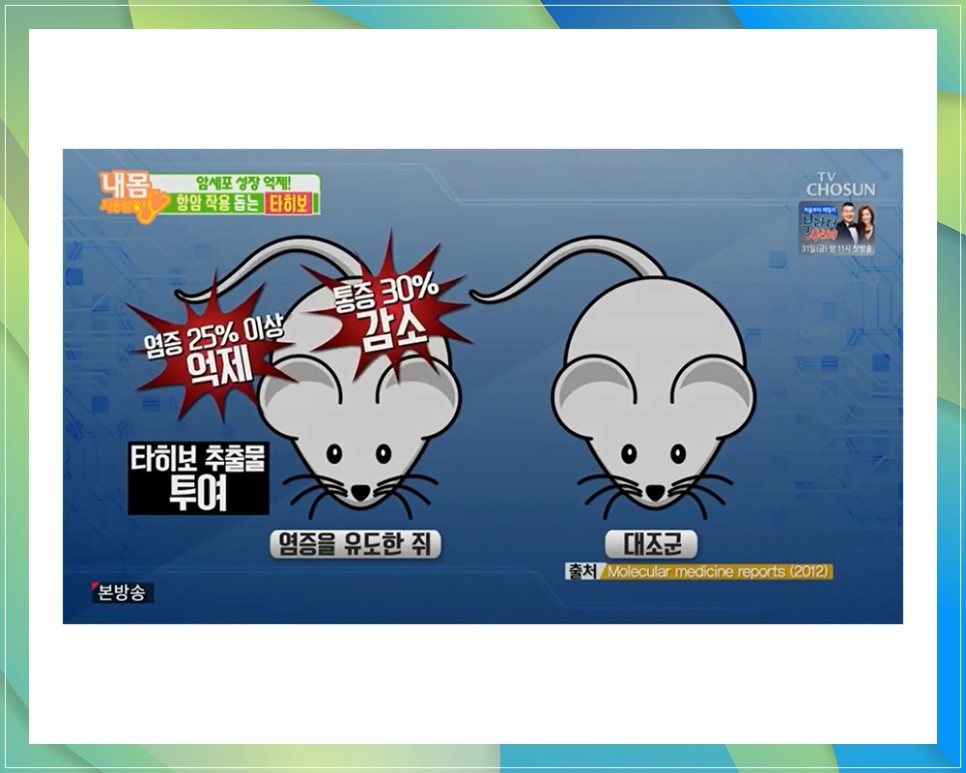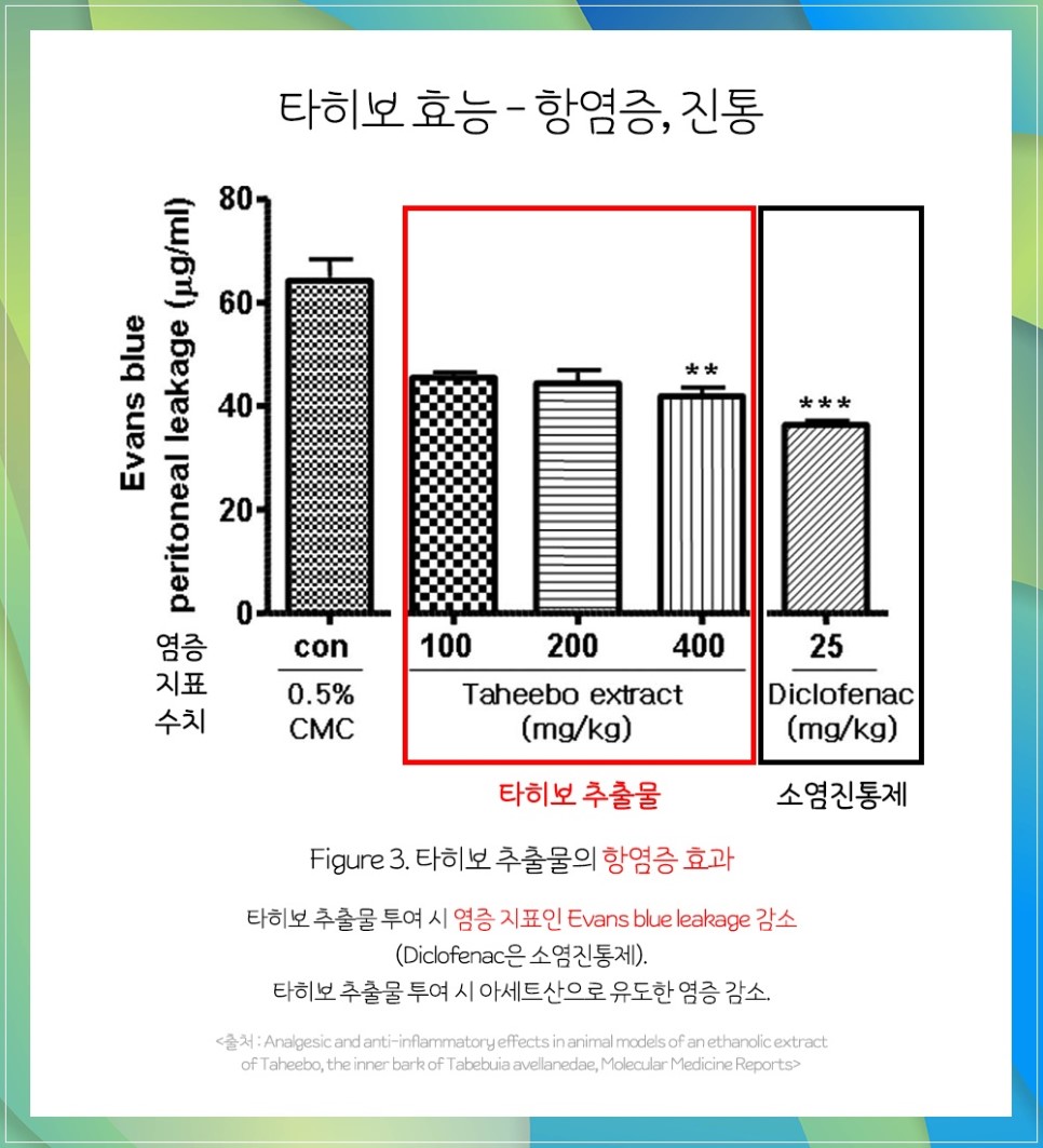 타히보추출물과 소염제 일부를 비교 실험한 결과, 타히보가 이들 소염제에 비해 진통 효능이 높게 나타났습니다.진통소염의 효능이 이 연구에서 확인되었습니다.