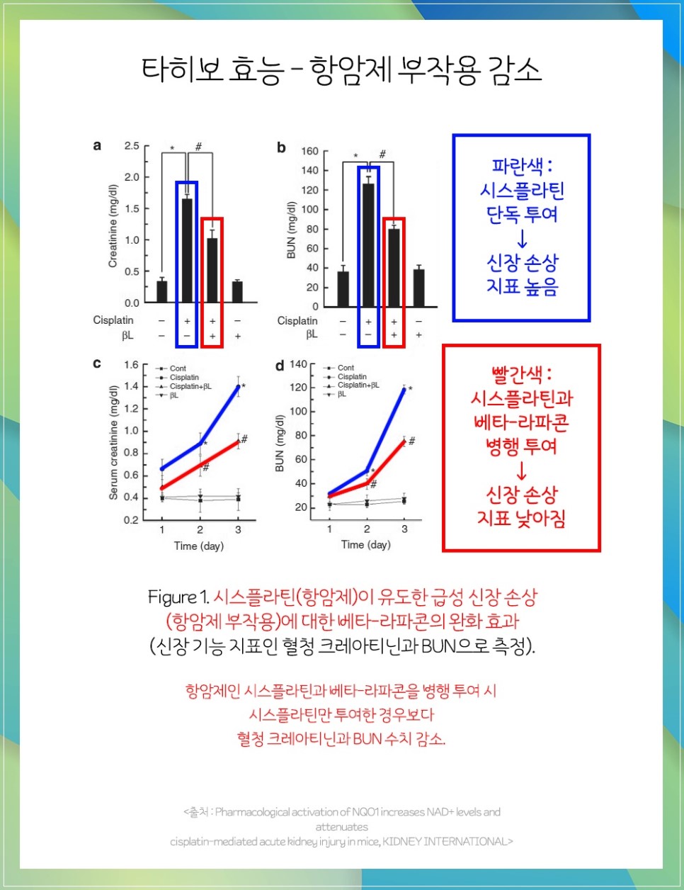 항암제인 시스플라틴을 사용하면 신장 독성 등의 부작용이 나타나게 되는 것입니다만.위 연구 결과를 보면, 시스플라틴을 단독 투여하였을 때와 베타-라파콘을 병행한 경우를 비교할 때 병행 투여함으로써 신장 손상의 가능성이 감소함을 확인할 수 있습니다.