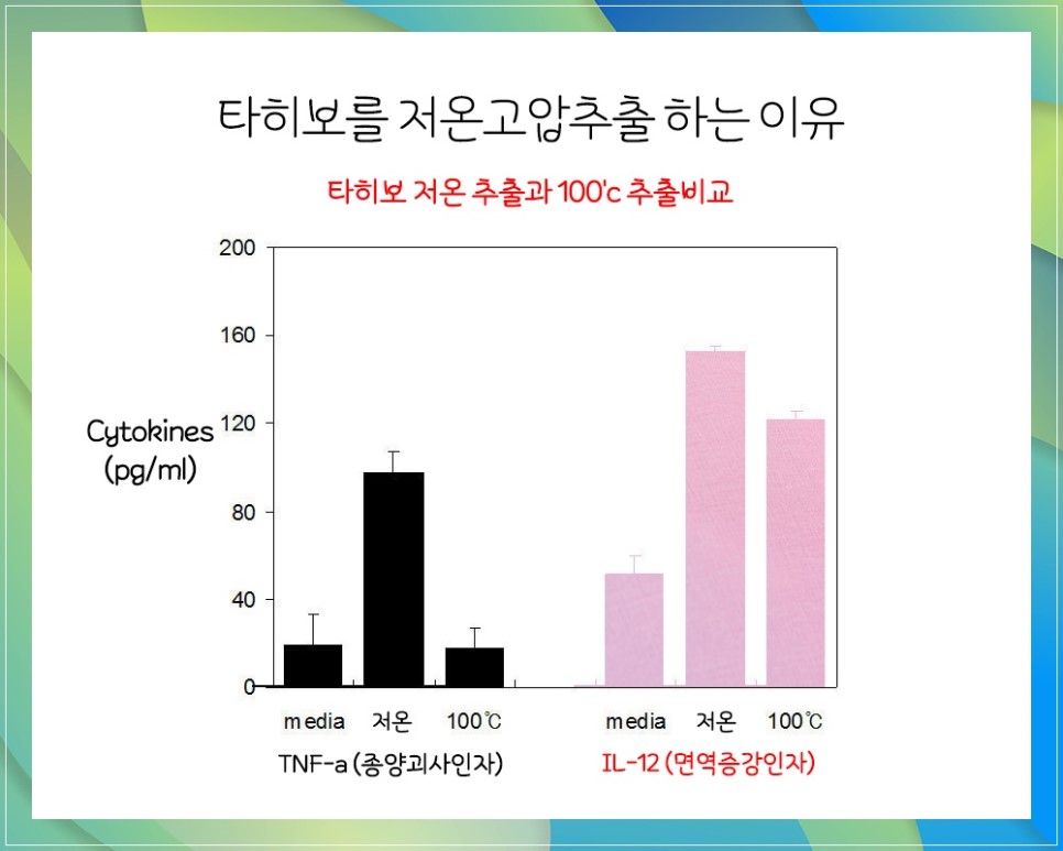 저온 고압 추출 방식으로 추출하면 타히보 유효 성분의 추출 비율을 기존 고압 추출 방식 대비 최대 5배 정도 높입니다.종양괴사인자와 면역증강인자와 같은 타히보 유효성분을 보전하고 효능을 유지할 수 있게 되었습니다.