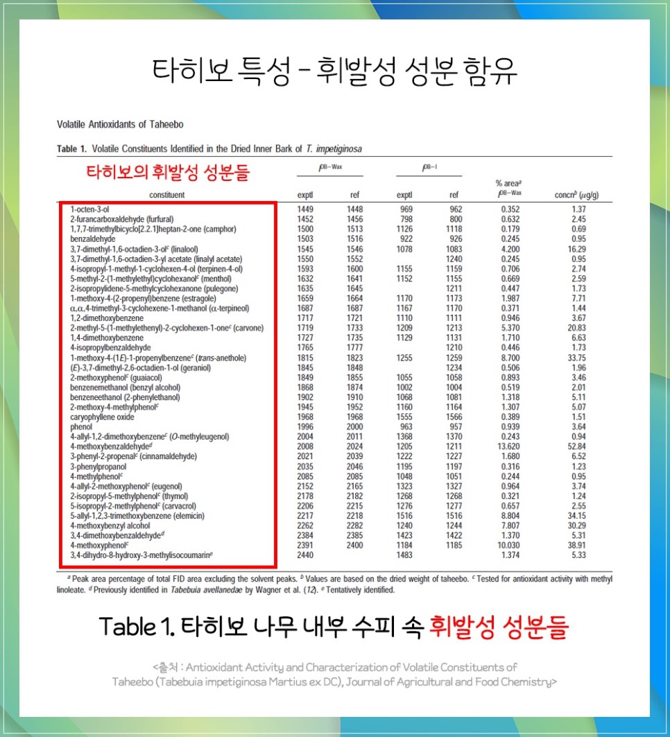 이처럼 여러 방면에서 우수한 효능을 발휘하는 유효성분은 많이 있지만 대부분 휘발성이 높은 성분이기 때문에 고온추출 방식으로 타히보 원료를 추출하면 공중 휘발성 추출 성분은 상당량 감소합니다.
