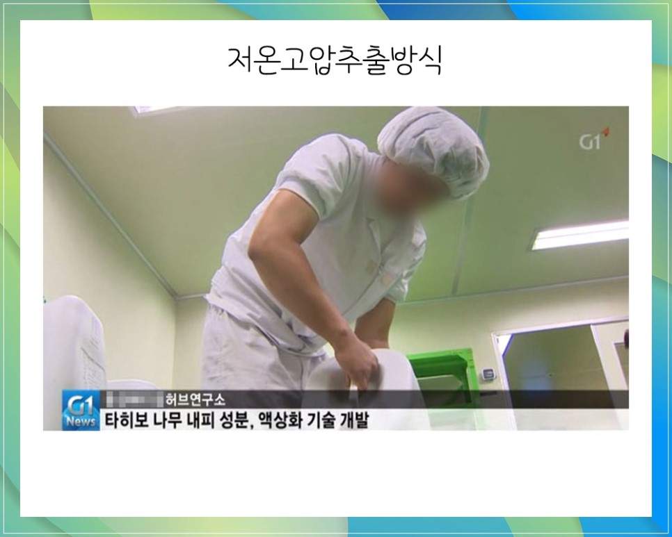 이러한 특성을 고려하여 저온에서 액상 형태로 타히보를 추출하는 저온 고압 추출 공법이 우리 기술력으로 개발되었습니다.