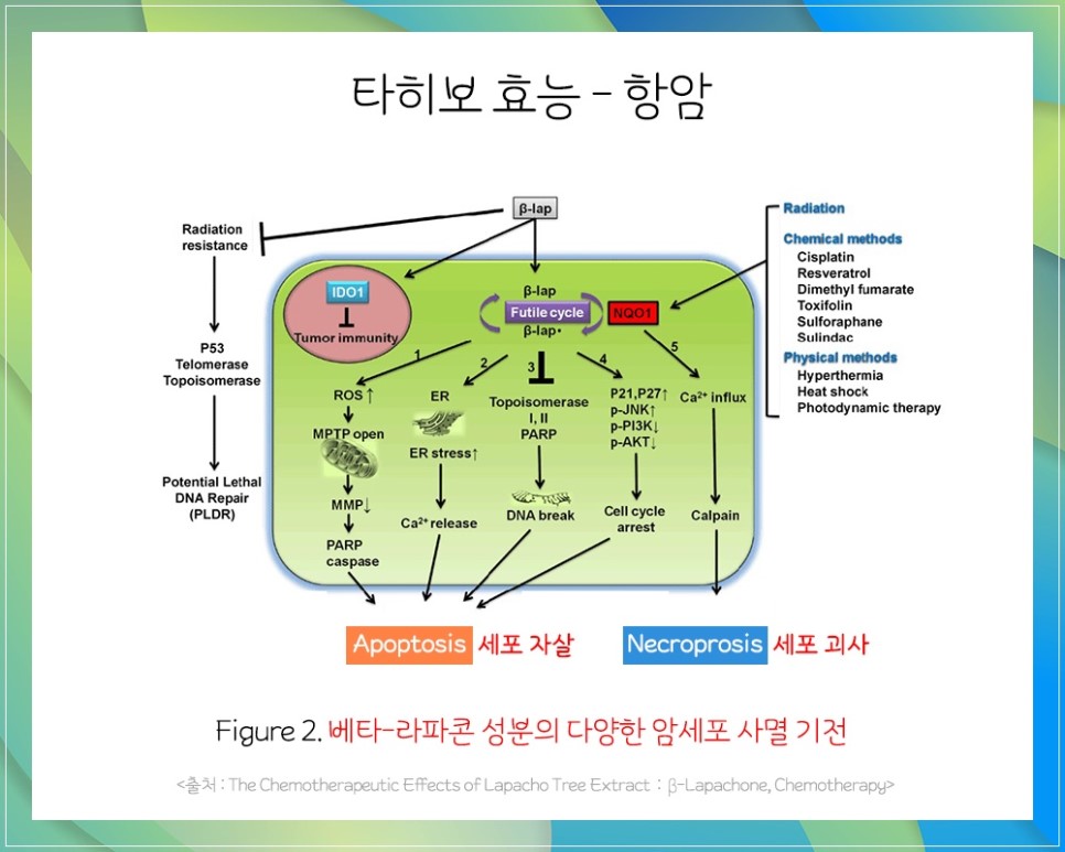 암세포와 싸우면서 암세포 DNA의 복제를 막아 암세포의 괴사와 자살을 유도하는 역할을 합니다.베타-라파콘이 투입되면 암세포 생존력이 감소하고 세포가 사멸한다는 것을 위 연구논문에서 확인할 수 있습니다.