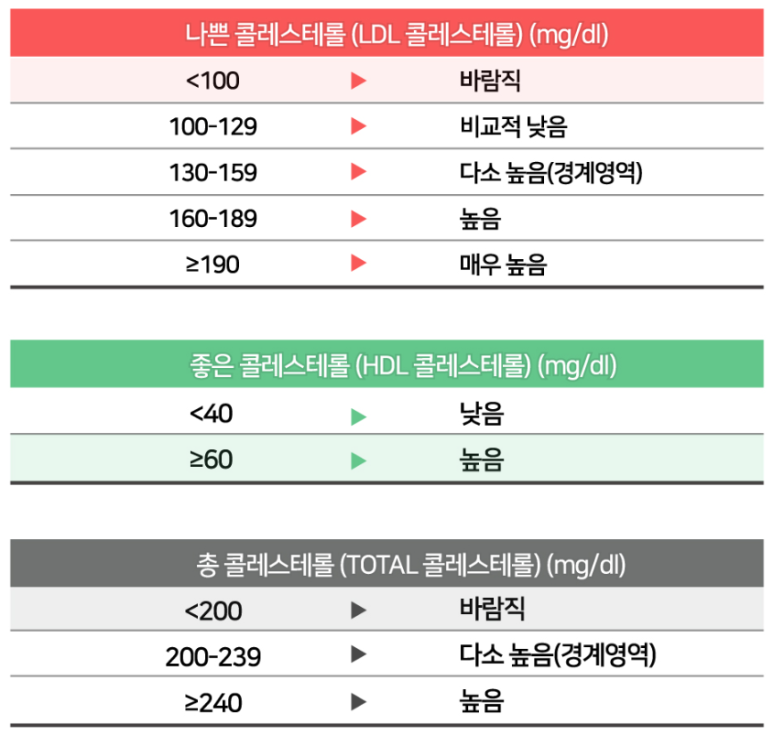 하지만 꼭 나쁜 것은 아니고 고밀도리포단백콜레스테롤(HDL)은 말초 조직에서 간으로 옮겨오는 역할을 하므로 이것이 높으면 혈관벽에 침착되어 있는 콜레스테롤 양이 줄어들어 동맥경화의 진행을 억제하는 좋은 역할도 한다고 합니다.정상 수치는? 200mg/dl 이하입니다.240mg/dl 이상이면 위험 수준, 그 중간은 위험해질 수 있는 경계 수준입니다.