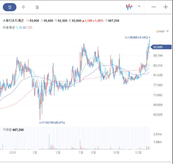 이에 따른 양사의 지분율 변화 및 향후 예상은 다음과 같습니다. 향후 예상대로 진행되어 양사의 시너지가 극대화된다면 좀 더 피를 섞을 수도 있겠네요.구분지분율 변화 향후 예상 CJ대한통운 CJ제일제당 40.16% 네이버 7.85% 쿠팡 로켓배송과 같이 네이버 쇼핑하면 익일배송 구축 CJ ENMC J 40.07% 네이버+스튜디오 드래곤 드라마 편성 확대 스튜디오드래곤 CJ ENM 54.53% 네이버 6.26% 네이버 웹툰 IP를 드라마화한 제작확대 오너의 뇌공인 스푼 이런 정보를 바탕으로 한 오너의 스튜디오드래곤 주가를 예측해봅니다. 다시한번 강조하지만 저의 귀여운 예상이니 재밌게 봐주시면 감사하겠습니다.