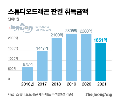 투자를 늘린다는 것은 인기작을 확대하는 것인데, 이미 다양한 성공작으로 인해 시청률이 어느 정도 담보된 스튜디오 드래곤으로 판권을 높게 책정하기 때문입니다.