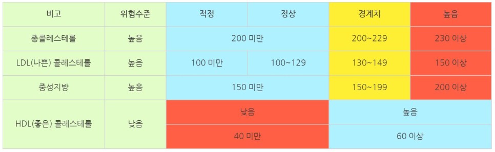콜레스테롤 검사는 공복 상태에서 혈액 검사를 해서 쉽게 알아볼 수 있습니다. 콜레스테롤과 중성지방의 정상범위를 확인하여 주십시오.▲총콜레스테롤200mg/dL미만▲LDL콜레스테롤130mg/dL미만▲HDL콜레스테롤60mg/dL이상▲중성지방150mg/dL미만