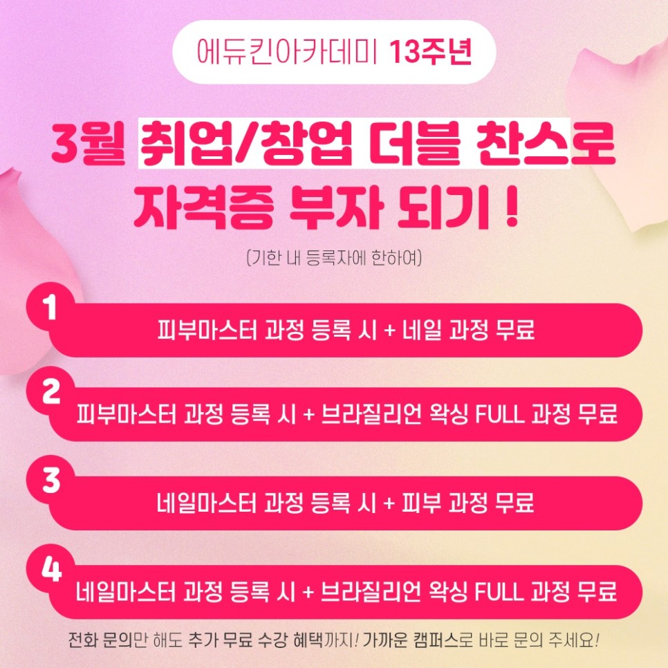 그리고 네일 취업 마스터 과정을 들어보시면 피부 마스터 과정 또는 왁싱 과정 중 2가지를 선택하여 들을 수 있는 혜택까지 있었습니다.