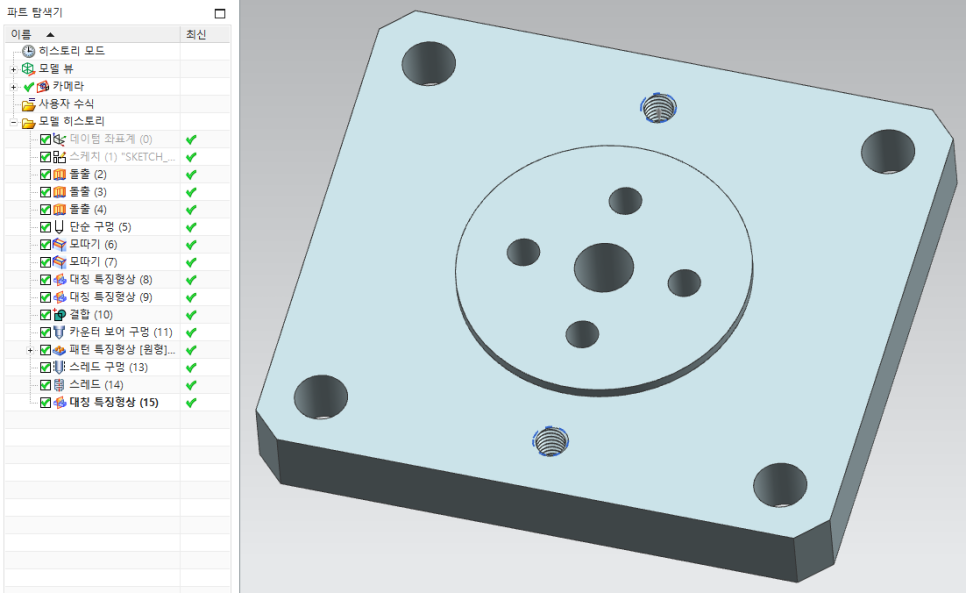 3, 특이사항(단위 : mm)(1) 드릴 지그자이크 베이스 부품 도면을 활용합니다.(2) 스케치 작성 시 모델링이 생성되기 쉬운 평면으로 진행합니다.(3)대칭 특징 형상 모델링 시 모델 히스토리 내의 형상을 선택하여 대칭합니다.(4)대칭 특징 형상 모델링 후 원본과 복사본을 각각 결합하도록 합니다.(5)스레드 홀 형상 모델링 시 KS 규격에 맞게 모델링 합니다.(6)모델링 완료 후 도면과 비교 검토하여 검증합니다.