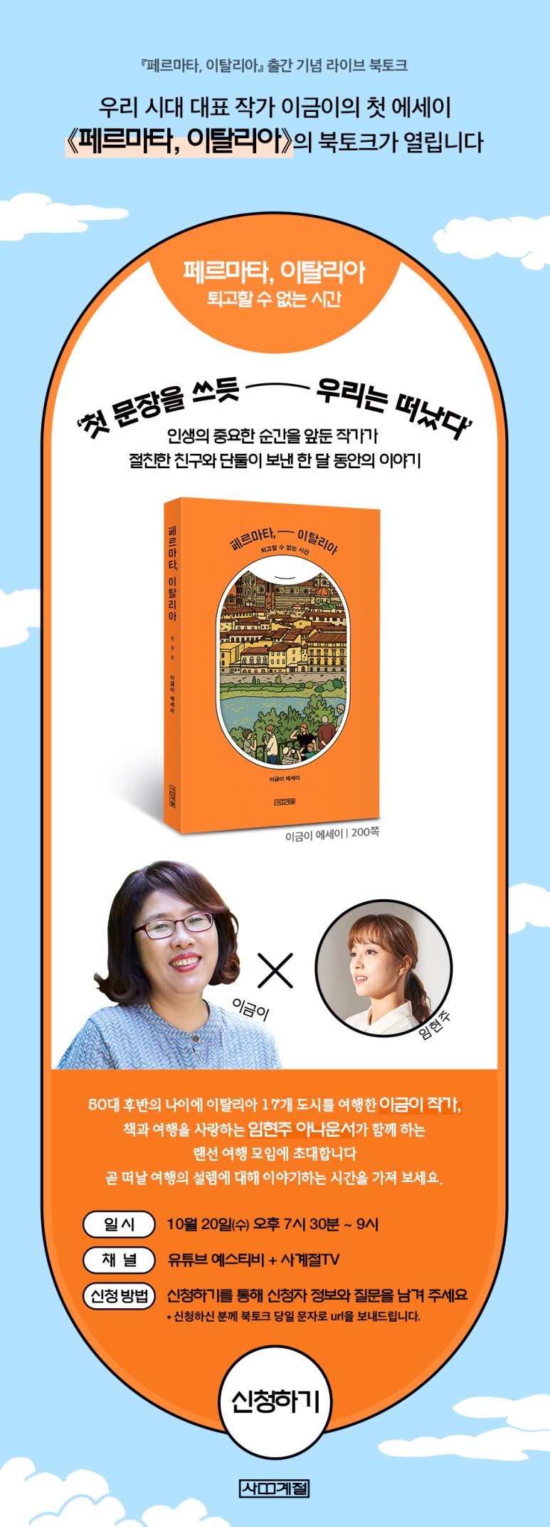 일시 : 10월 20일(수) 오후 7시 30분~9시 채널 : 유튜브 예스티비+사계절TV 신청방법 : 페이지나 신청링크를 클릭하여 신청자 정보와 질문을 남겨주세요.* 신청하신 분께 북톡 당일 문자로 url을 보내드립니다.