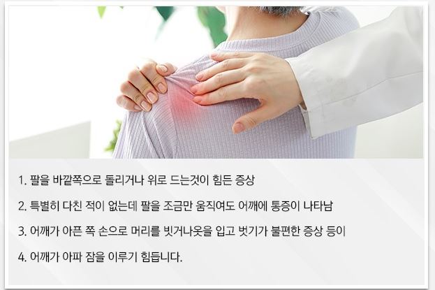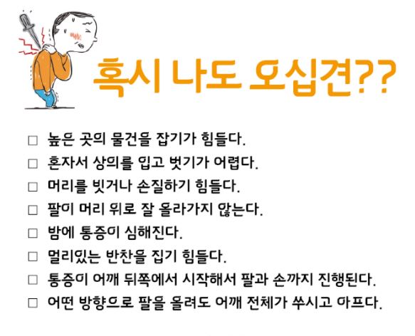 오십견은 유착성 관절낭염이라고도 하며 어깨 관절이 딱딱해져 심각한 후유증이 남는 어깨 질병입니다.위의 체크리스트를 통해 어깨에 문제가 없는지 체크하고 2주 이상 지속된다면 방치하지 말고 문제의 심각성을 인지해야 합니다.