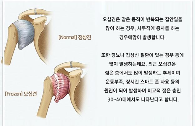 관절을 보호하기 위한 관절낭은 여러 원인으로 인해 염증이 생기고 관절 자체에 구축이 발생하여 어깨나 척추를 딱딱하게 만듭니다. 단순 노화가 아닌 여러 내과적인 문제에서도 나타날 수 있으며 건조한 어깨와 일자 척추, 그리고 근력 약화와 스마트폰 중독도 하나의 원인으로 오래 누적되어 40~50대 무렵에 문제를 발현시키게 됩니다.사실 그 전부터 문제는 있었지만 놓치거나 모르고 살면서 키우는 경우가 많습니다.