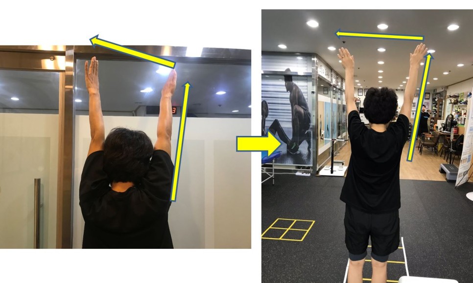 회전근개 파열 후 방치되어 통증이 개선되지 않는 순간 관절낭에 문제가 생겨 오십견을 경험한 경우입니다. 어깨 관절 굴곡 평가와 외전 평가 시 좌우 불균형한 모습과 함께 어깨 통증을 확인할 수 있었습니다. 이완 프로그램과 인지 운동, 그리고 교정 운동 후 어깨 통증 없이 가동 범위가 개선된 굿 케이스입니다.왼쪽 사진 비포 오른쪽 사진 애프터.