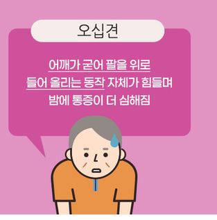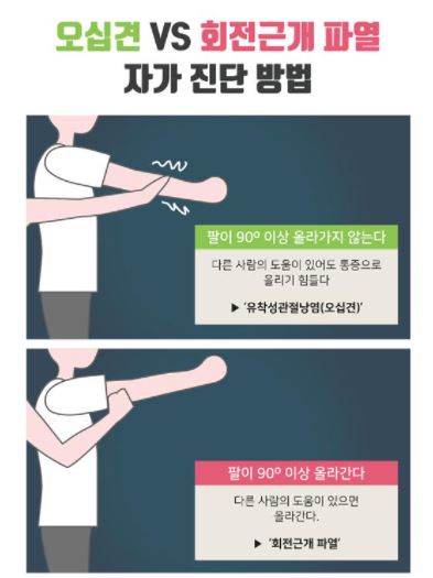 오십견과(유착성관절낭염) 회전근개파열을 혼동하는 경우가 많은데, 이 두 가지 가장 큰 차이는 각도별 반응의 차이가 있지만 오십견의 경우 90도 이전으로 제한돼 옷을 갈아입는 것 자체가 어려운 부분이 있으며, 회전근개파열의 경우 특정 각도에서 힘을 주어 올리기는 어렵지만 90도 이상 올랐을 때는 어깨 통증 없이 올라가 내려가는 상황에서 어깨 통증이 발생하거나 무기력함을 호소할 수 있게 됩니다.