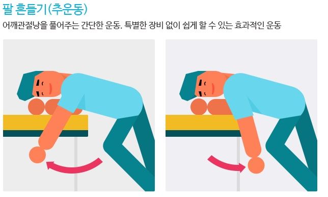 어깨 수술을 하거나 가동범위 제한이 있을 때 시계추운동을 통해 어깨관절을 신장시키고 스트레칭운동을 통해 짧아진 근육과 근막을 이완시켜 관절낭의 움직임을 조금씩 확보해 줍니다.