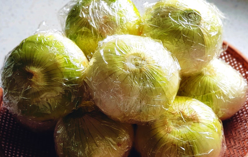 제가 양파를 보관하는 방법, 그물 그대로 망바구니에 넣어서 하나씩 꺼내 씁니다. 그물바구니는 북향 부엌에서도 가장 어둡고 서늘한 곳 옥상으로 가는 문 앞에 위치합니다.
