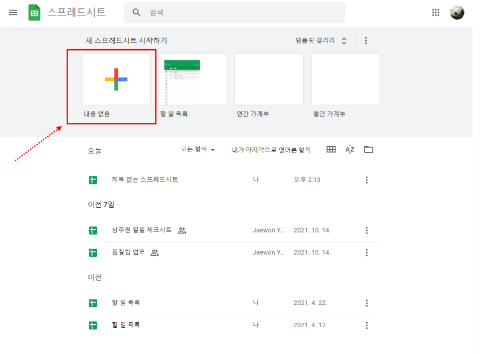 - 구글 로그인 후 스프레드시트를 클릭한다.