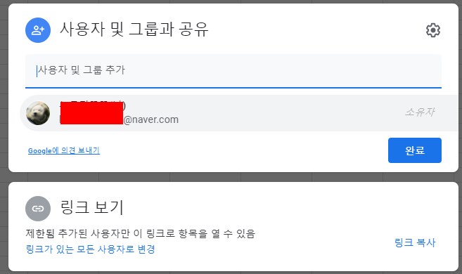 4. 권한을 부여한 후 송신한다.(뷰어: 열람만, 댓글 작성자: 댓글 작성 가능, 편집자: 시트 수정 가능) 3. 엑셀 파일 업로드